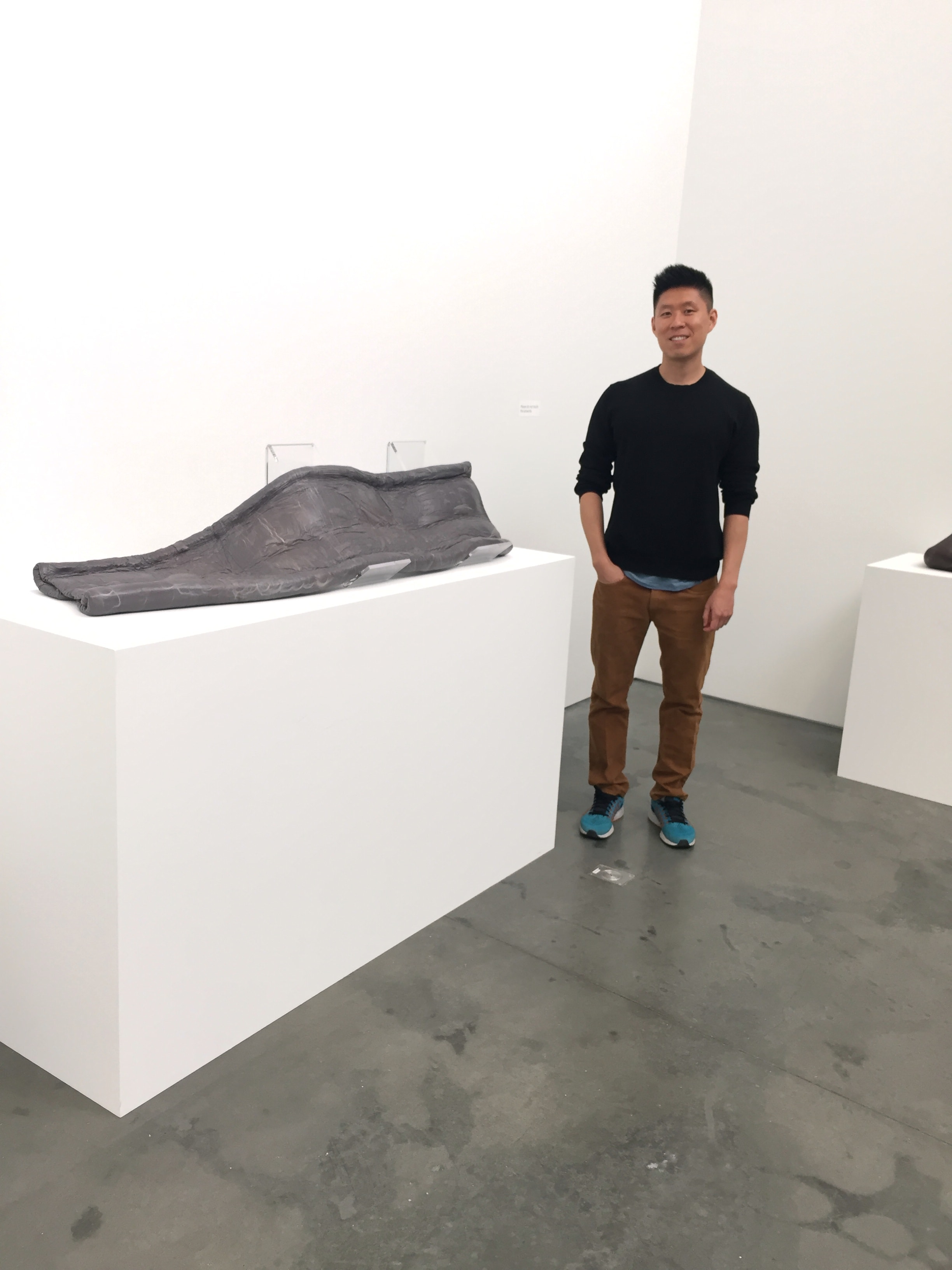 For the MFA exhibition, Chuang drew inspiration from his own body. He explains that clay was the “best placeholder for [his] body, because it performs on its own. When it dries, it shrinks, and just like our body, it has water. When we get older we shrink, and then when [the clay] shrinks, it wrinkles and cracks, same with our bodies…and then it does what you can’t control.” Chuang’s technique of using a plastic skin to encase unfired clay is unique not only because it helps to retain the clay’s shape, but also keep its moisture. My curiosity led me to ask if these shapes take place organically, or whether Chuang works with a preconceived notion of what the sculpture will look like. Chuang replies that he does not have any preconceived notion of his finished work, since the clay is very “weighty.” His physical capability to lift a certain amount of clay limits how much he will use for his works.